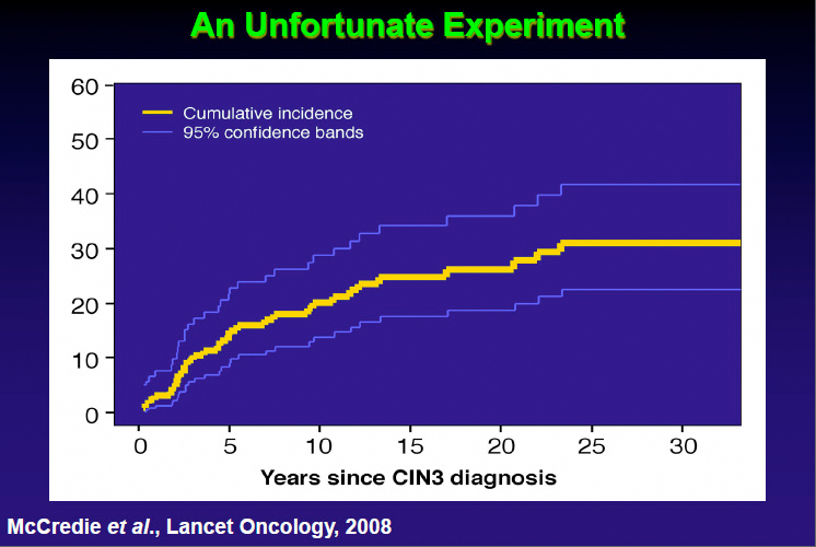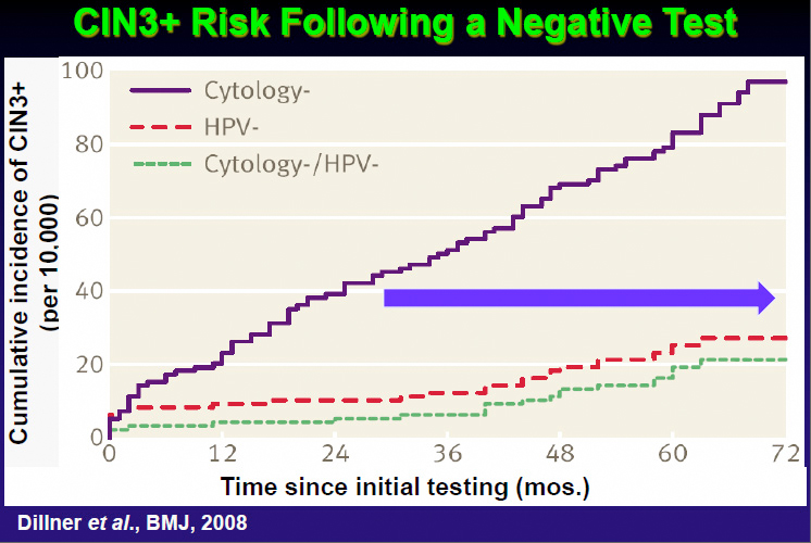 • In the case of cervical cancer prevention, we want a positive screen to identify those women who have or may develop CIN3, which can be treated before it becomes invasive. CIN3 itself is NOT disease; it is a marker of cancer risk.