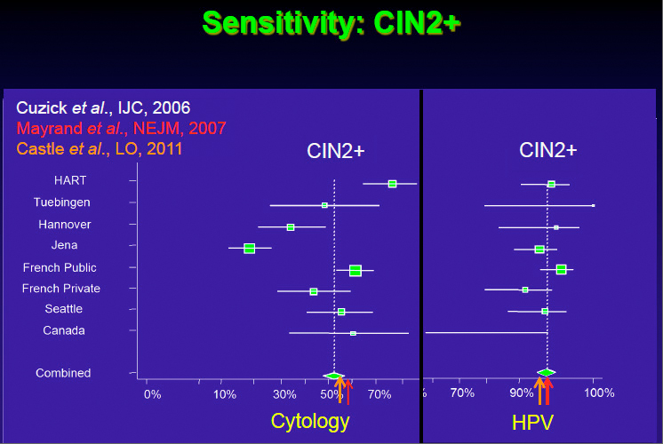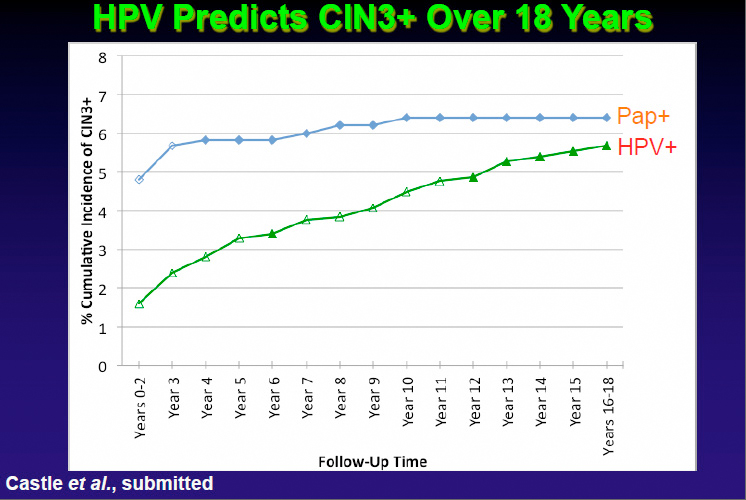 • Type-specific detection does not predict CIN2+ or CIN3+ better thahn pooled detection (Gage et al, JCM, 2011; Marks et al, JCM, 2012). HPV pos/pos is a very strong predictor of CIN3+ (Kjaer et al, JNCI, 2011)