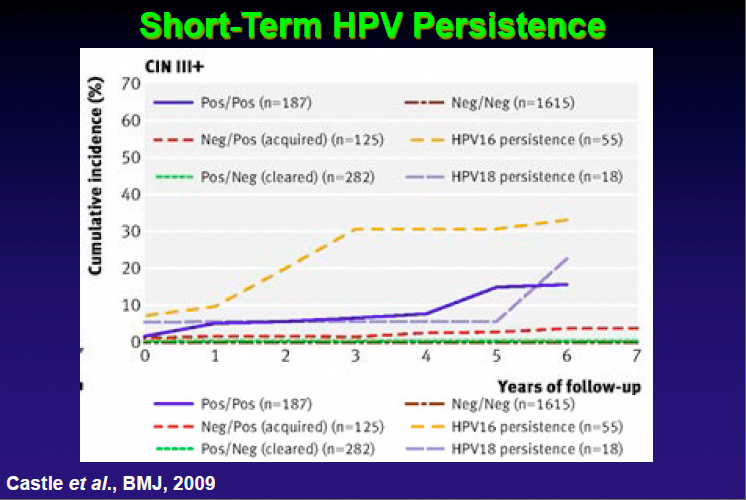 • Most women (>80%) who test HPV pos/pos have a type-specific, persistent HPV infection (Castle et al, BMJ, 2009)